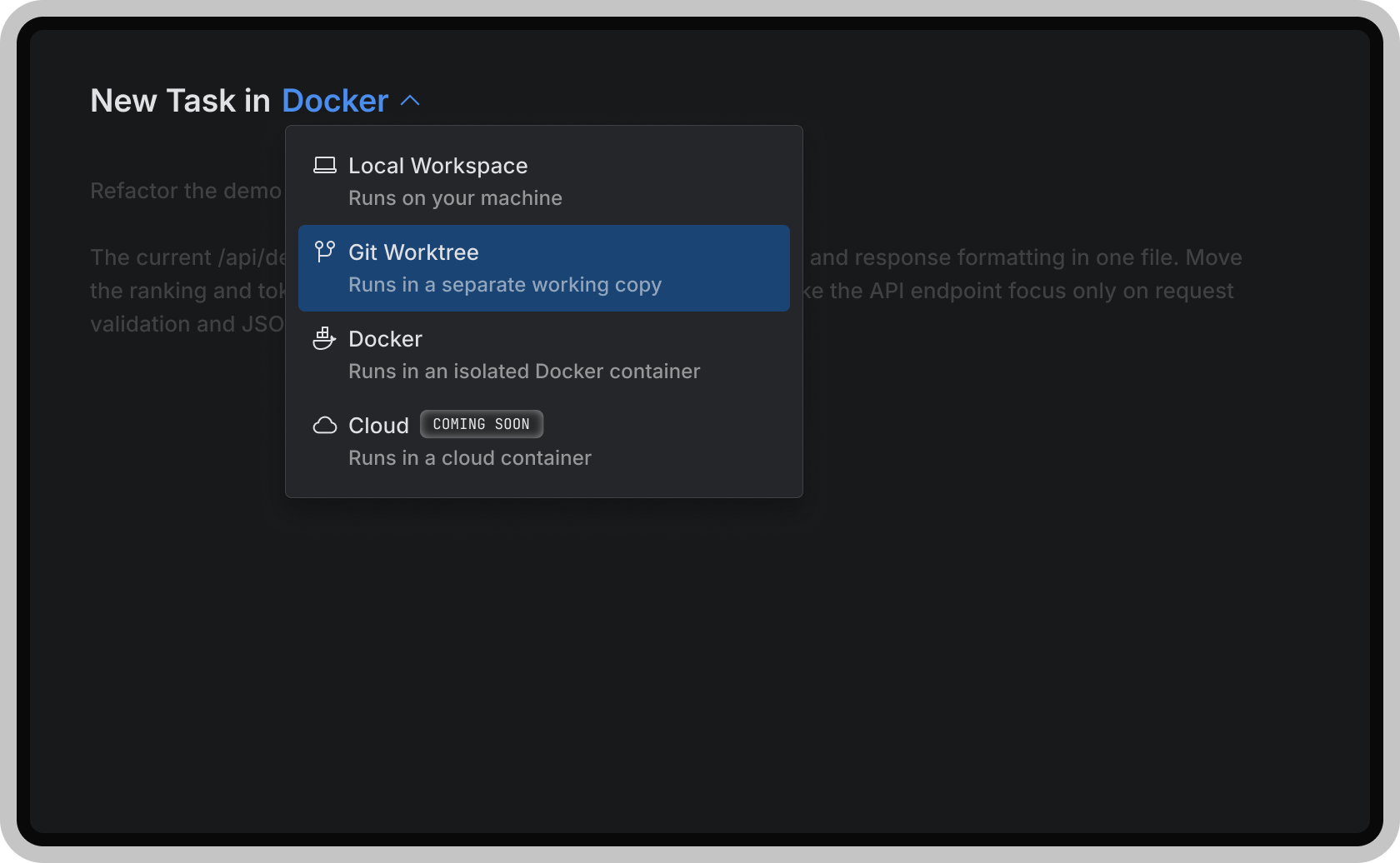 自動處理底層的環境配置,透過 Docker 容器 或 Git worktrees 來保持每個任務的獨立與隔離,讓多個 AI 代理同時運作也不會干擾彼此。